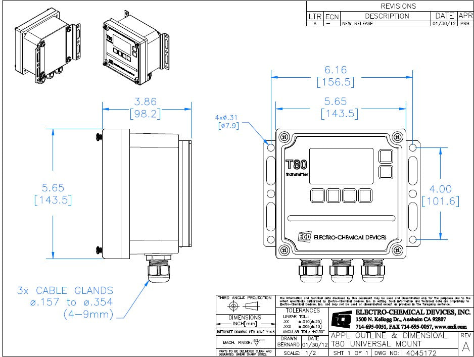 The ECD Model T80 Universal Transmitter is a single or dual channel transmitter designed for the continuous measurement of pH, ORP, pION, Dissolved Oxygen, Turbidity, Conductivity or Resistivity in a general purpose industrial environment. The Model T80 transmitter digitally communicates with any ECD Model S80 Intelligent Sensor, automatically configuring the transmitter’s menus and display screens to the measured parameter.