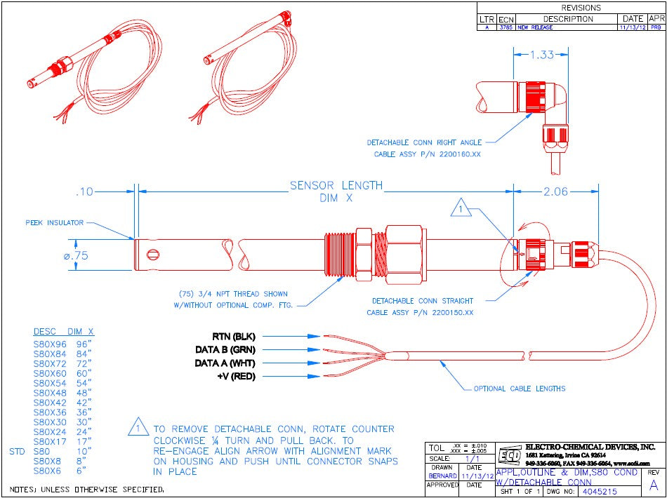 The Model S80 Intelligent Sensors are a complete line of liquid analytical sensors including pH, ORP, Specific Ion, Dissolved Oxygen, Conductivity and Resistivity. The S80 sensors have two Universal Sensor Designs; Insertion/Submersion or Valve Retractable with flared end to prevent blow out. Various materials of construction are available to maximize sensor performance while minimizing cost of ownership. The ECD S80 Conductivity and Resistivity sensors cover the full measurement range from High Purity water to concentrated brines. Constructed of 316 Stainless Steel, with PEEK insulators and dual VITON o-ring seals.