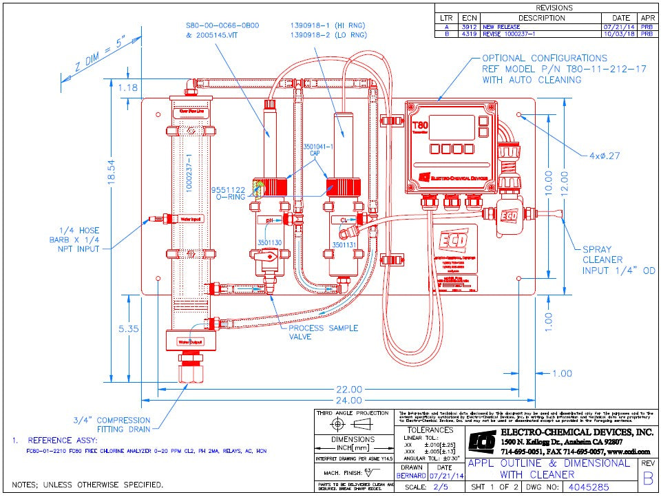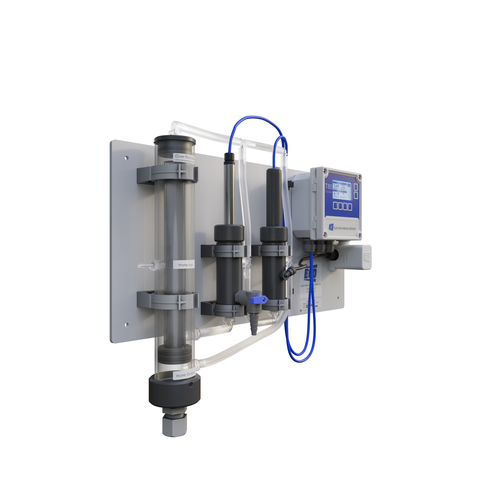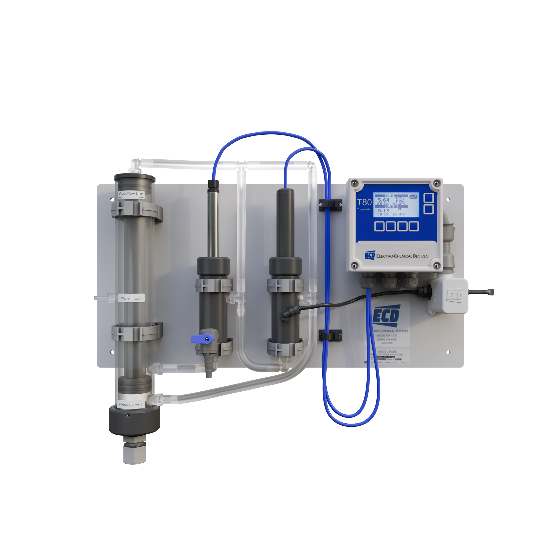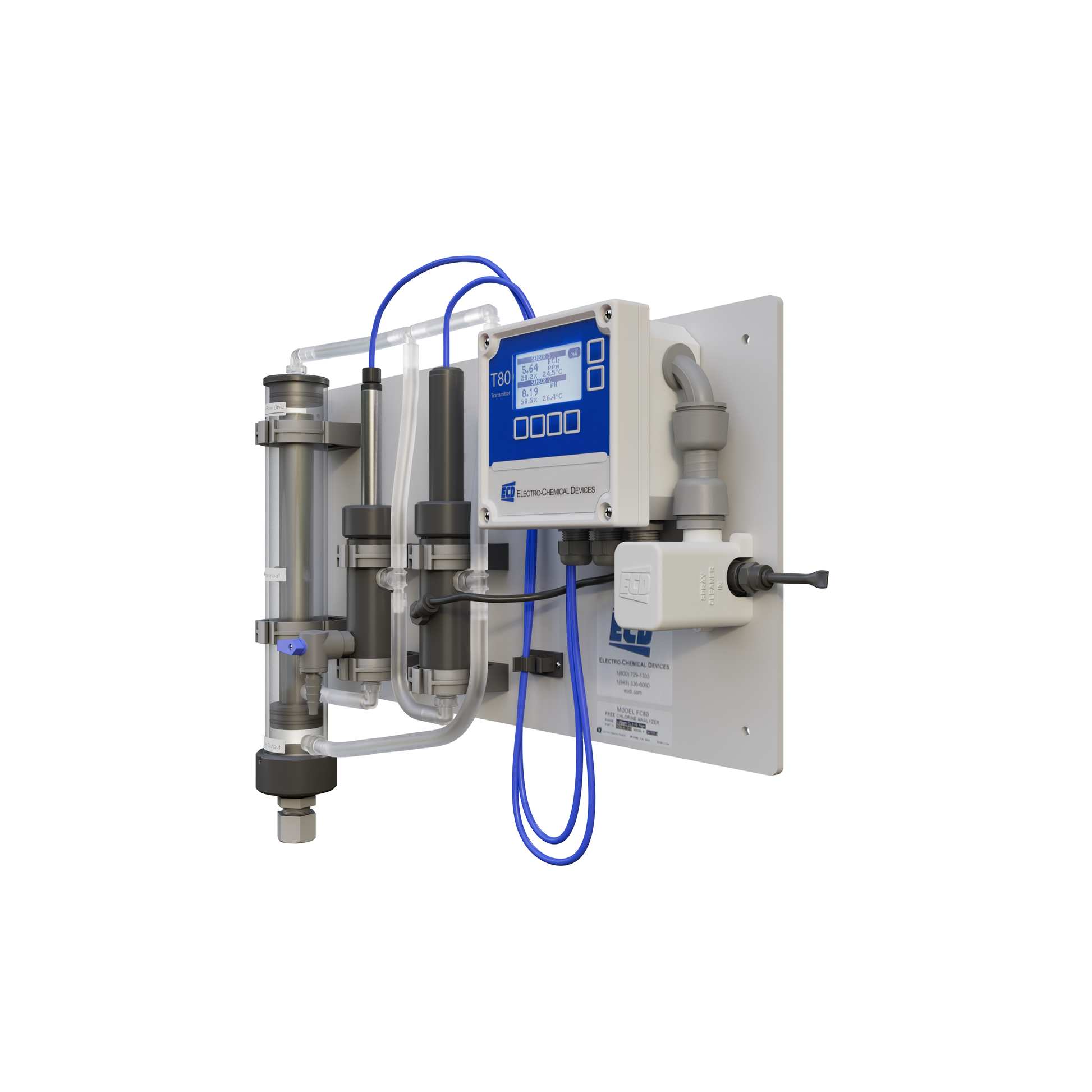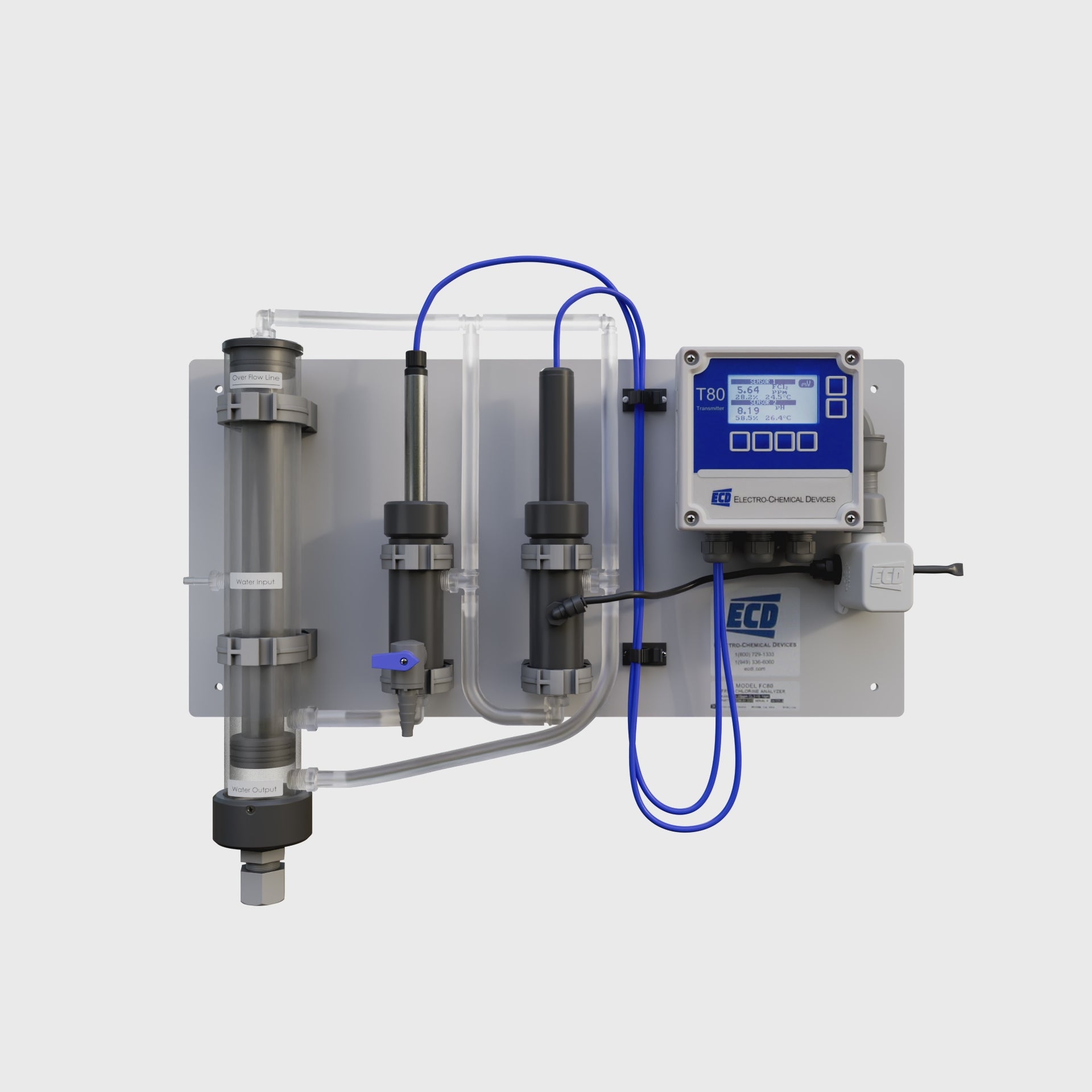 Reagentless Peracetic Acid Analyzer: The ECD PA80 Peracetic Acid Analyzer is a panel mounted, ready to use Peracetic Acid Analyzer. It is designed to monitor peracetic acid (PAA) in industrial cooling water, rinse water, municipal wastewater or other freshwater samples containing PAA in the range of 0-20 ppm and 0-200 ppm. The Peracetic Acid Sensor (PAS) is a three electrode amperometric sensor that measures all peracetic acid in the water. The PA80 Peracetic Acid Analyzer features a plug and play design that incorporates a flow control device, a pH sensor, a PAA sensor and the T80 transmitter are conveniently mounted on a PVC panel. Connect the sample and drain lines, connect the power and outputs and it is ready to use. The PA80 Peracetic Acid Analyzer is calibrated at the factory before shipment, additional Calibrations are accomplished by Lab comparison. The Model T80 transmitter is a 100-240 VAC line powered instrument. The standard configuration has two 4-20 mA outputs and a RS485 serial communication port with MODBUS®RTU. Three (3) SPDT, 1 form C, 250 VAC, 10 Amp resistive maximum, relays are user configurable as Hi/Lo alarms with expiration timers, Periodic Timers or as Fault alarms.